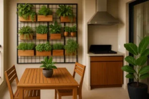 A modular vertical garden for gourmet balconies adds even more purpose. It turns your outdoor space into a fully functional kitchen garden, where you can pick basil, rosemary, or mint fresh from the wall while preparing your favorite meal.
